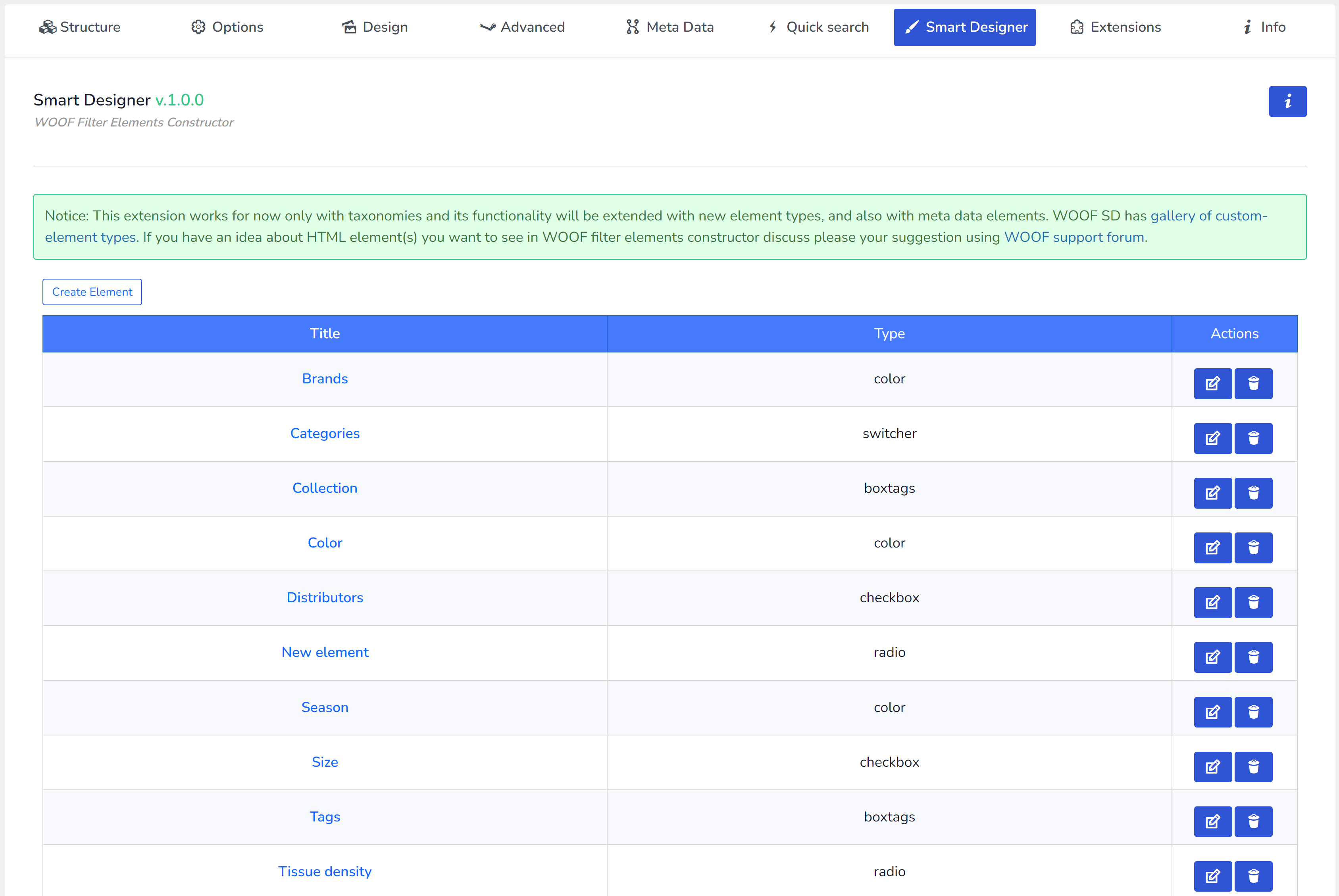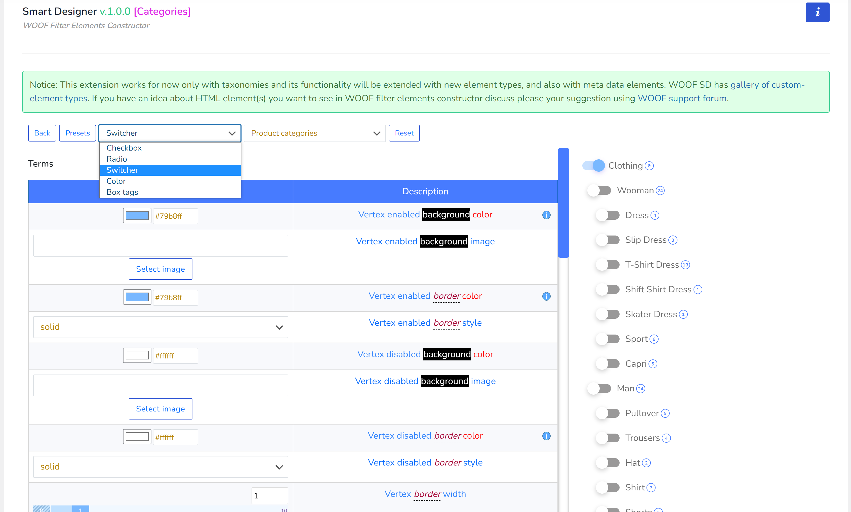 Smart Designer is also developer-friendly, and give for site developers ability to create their own custom filter elements